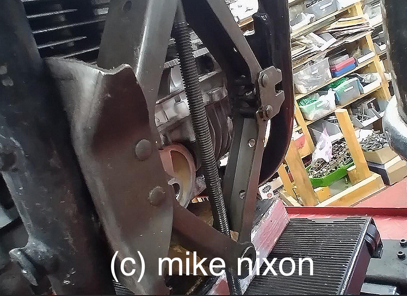 Here's another picture. This one is a lot more recent. It's a Honda SOHC 750 that my customer crashed hard enough to almost break off both steering stops and and position the right side exhaust system differently than the left on the bike. That's a scissors jack spreading the front frame downtubes so the engine can be slotted back in after a head gasket replacement. Wild huh? The point of all this? Hopefully, it has made you think a little about damage and modifications to your bike. They are not without consequences. They affect future servicing, and they can affect safety. |