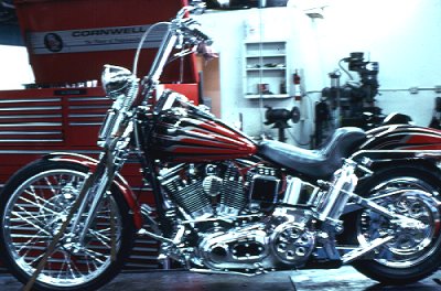 Cruiseamerica owner Bob Smalley's bike started out as a 1987 Harley-Davidson FXRS. Sporting STD 30o dual-plug heads ported by Carl's Speed Shop, a 0.620" cam, Axtell cylinders, a Bandit clutch, a Tech starter, and a RevTech carburetor mated to an S&S air cleaner, the 13:1 CR bike cleared 120 rear wheel horsepower on almost its first dyno session. The machine placed in the top five at Daytona's 1995 Harley shootout. The bike made 195 hp on the bottle. The entirely civil, electric-starting bike was a joy to ride. After building it, I rode it around for several days to break it in and flight-test it, and during that time all I could think of was a piped V-Max with 1" handlebars. It had that kind of acceleration.