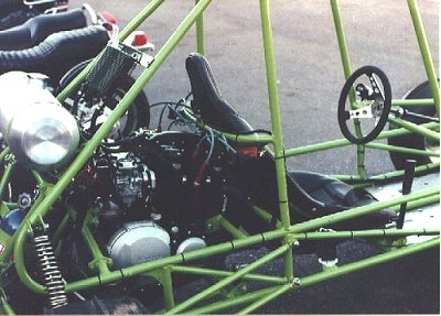 This little beauty is a later Ninja 750 engine, hooked up to a early Kawasaki turbo unit, and dropped into an automotive sand rail. Note the Autometer tach, which most of the machines we put together use.
