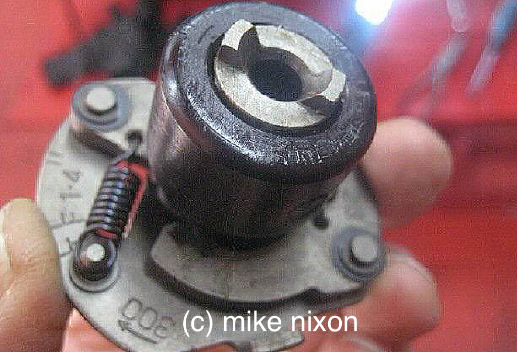 This causes the flyweights to become partly deployed despite being at rest. The result is the ignition under-advances at higher rpm. |