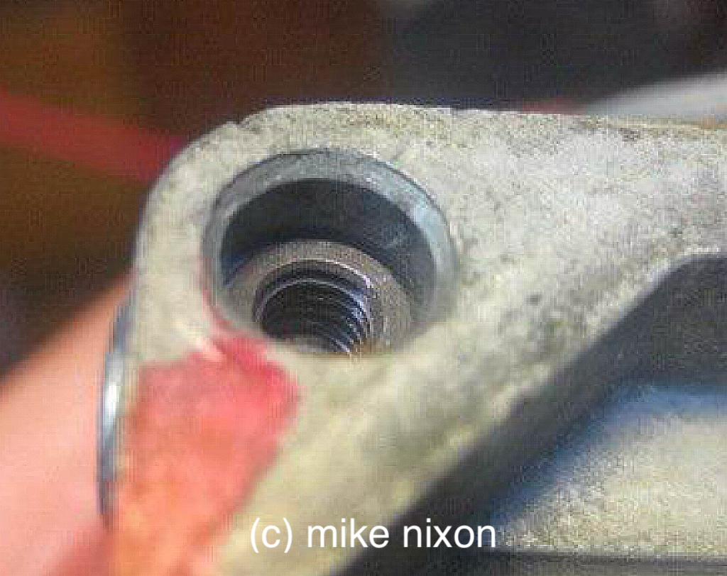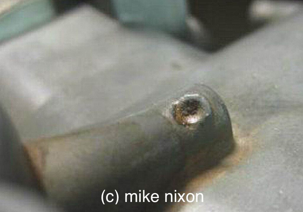 A very common need on the PD carburetor is that folks overtighten the float bowl screws. Some of the threads are tricky to repair because they are sunken into the casting. This is a Timesert-repaired thread, which properly installed works very well here. I have saved many carbs this way. |