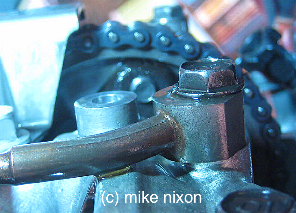 You can tell from the cam chain that this is a VF500 engine. All the other first-gen V4s had Hy-Vo cam chains. This one is roller. What you're looking at is a mistimed cam. It's very easy to get the cams out of time on a Honda V4 because the marks are difficult to use. Honda actually taught us in factory school to use a Sharpie. The symptom of having even one of the four cams slightly out of time is the engine runs fine, maybe a little flat, but fine, all over, idle to redline. When cold. But when hot, the idle will not stay put. It goes all over. Stalling is common. |