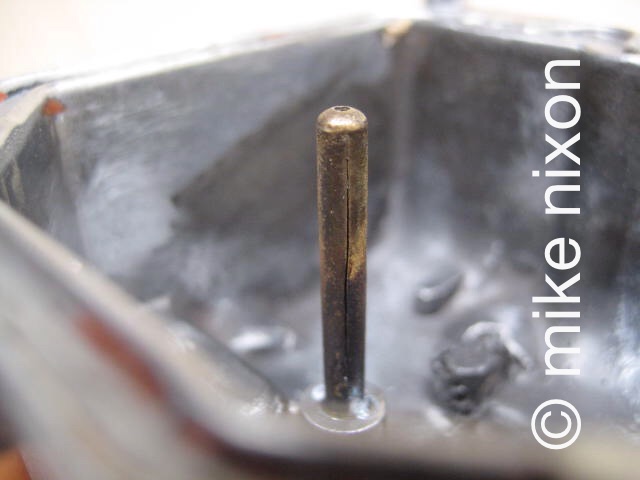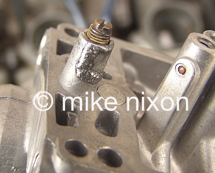 Speaking of repairs, I have talked to other rebuilders and it seems few consider repairing an important aspect of rebuilding carburetors. They are likely as not to return your carbs to you with problems you might not even know your carbs have, simply because the rebuilder is not equipped to handle the problem. This example is an easy one, one that most rebuilders know how to fix, a cracked overflow standpipe. But you need to know to LOOK for it first, then how to fix it. Very few do either. |