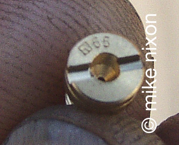 Now let's look at a kit jet. See the marking, 65? Guess what? The jet is actually much larger. And, a real giggle, this is a Keihin style jet (came in a kit for a Honda street bike) its Chinese maker (copier) marked with a Mikuni mark! Do you want to be at the mercy of a carb rebuilder who uses this junk? How many of them do you think even double-check the sizes of jets? |