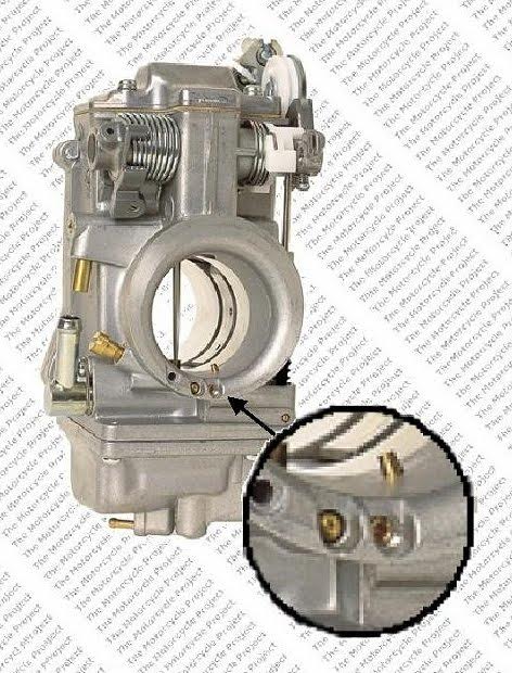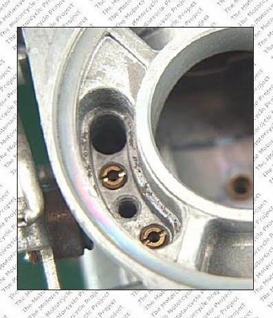To make this frothing idea work, these holes have to be plumbed to the outside of the carburetor, to atmospheric air. Such passages as this are called "air bleeds", just exactly as in the case of some spray paint guns. One thing lost on some mechanics is that these air bleeds are nearly as subject to fuel gel buildup as are the fuel jets themselves. Keihin carbs especially. |