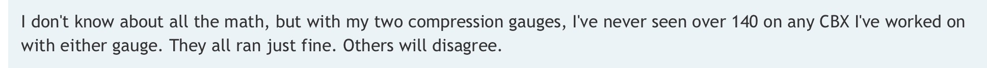 As I always tell CBX owners, if you want your 600+ pound CBX to perform like a Vespa, then sure, accept that compression. It's a long way from the 170 psi the bike was manufactured with. |