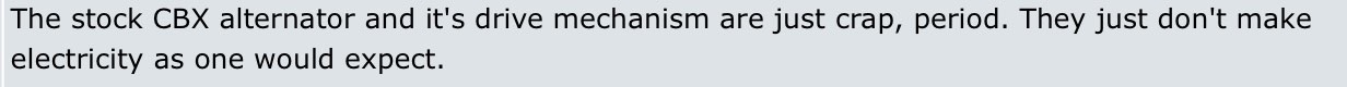 The U.S. model CBX alternator produces more power than the alternator on the GL1100, the touring bike that was contemporary with it. I don't think 350 watts is something to disregard. |