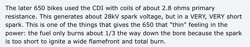 One, the CB650 does not have CDI ignition. Two, an ignition coil's potential is just that, potential, not what will ever be observed. Three, the vintage SOHC CB650 is a really good performing motorcycle. |