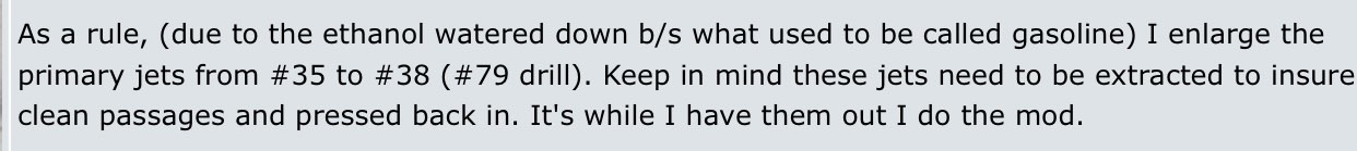 There is no good reason to do this. Not because of ethanol, not because of changes to gasoline, and not because Honda made the carbs too lean. |