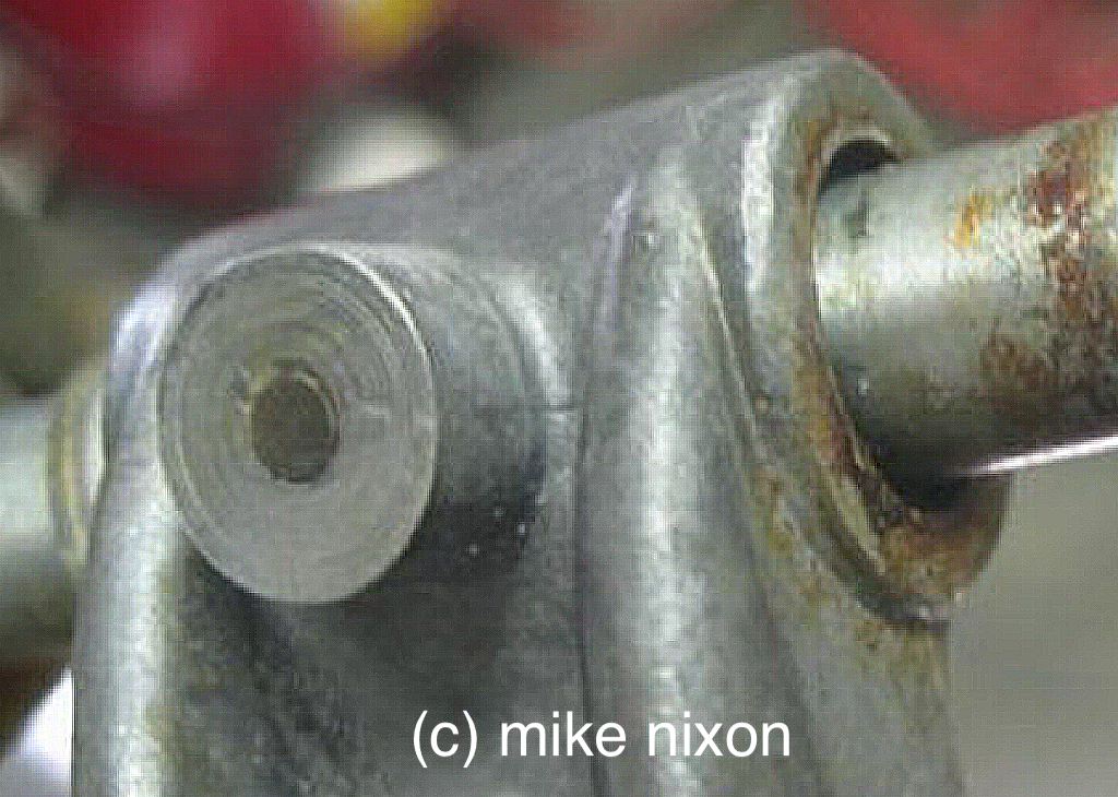 This is all too common on SOHC four carburetors. Shouldn't be though. See the chewed-up locating groove in this shaft? |